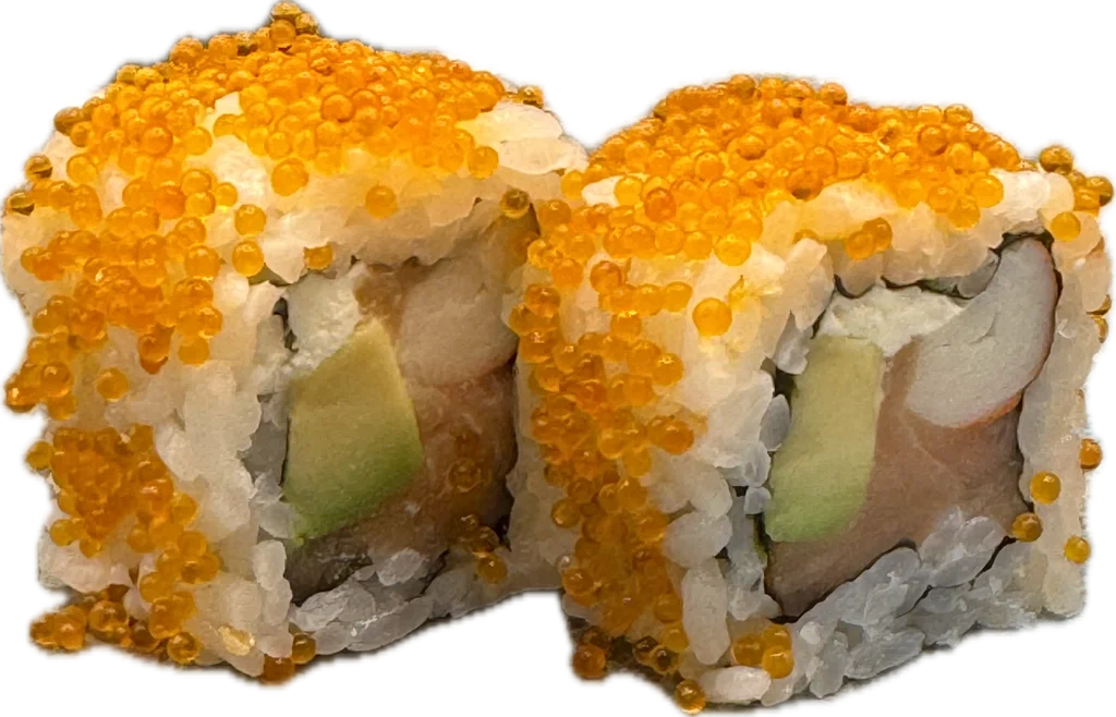 Cream Cheese Roll – Un mélange raffiné de saumon frais, avocat et surimi, rehaussé d’une touche crémeuse de fromage et d’un topping d’œufs de tobiko orange. Une création onctueuse et croquante à la fois.