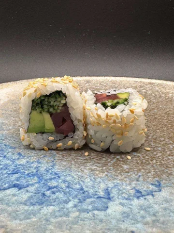 Crazy Tuna – Ce sushi original associe thon épicé et avocat crémeux, recouverts de thon frais et de wakame, le tout sublimé par une sauce yuzu miso. Une expérience unique dans notre restaurant japonais à Agadir.